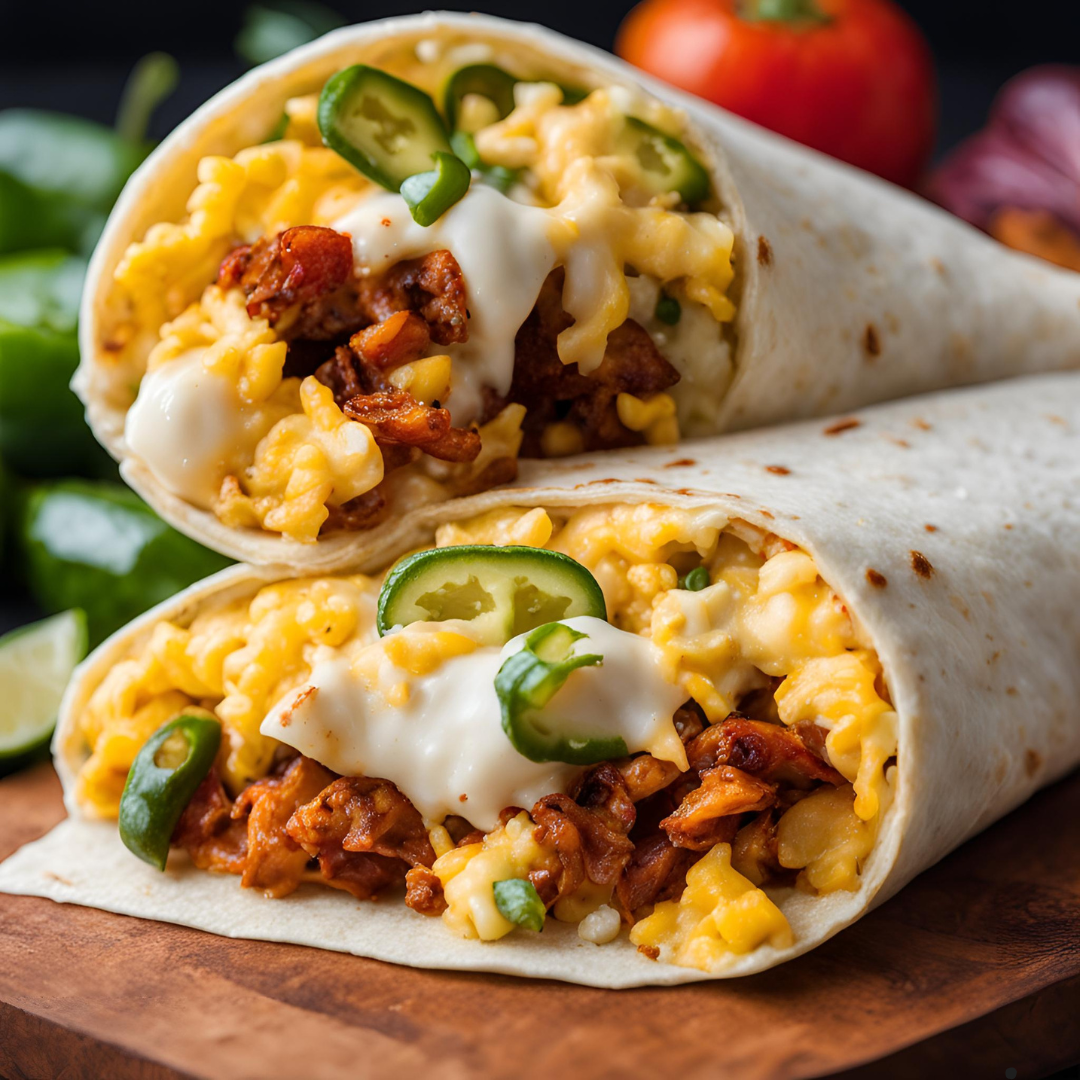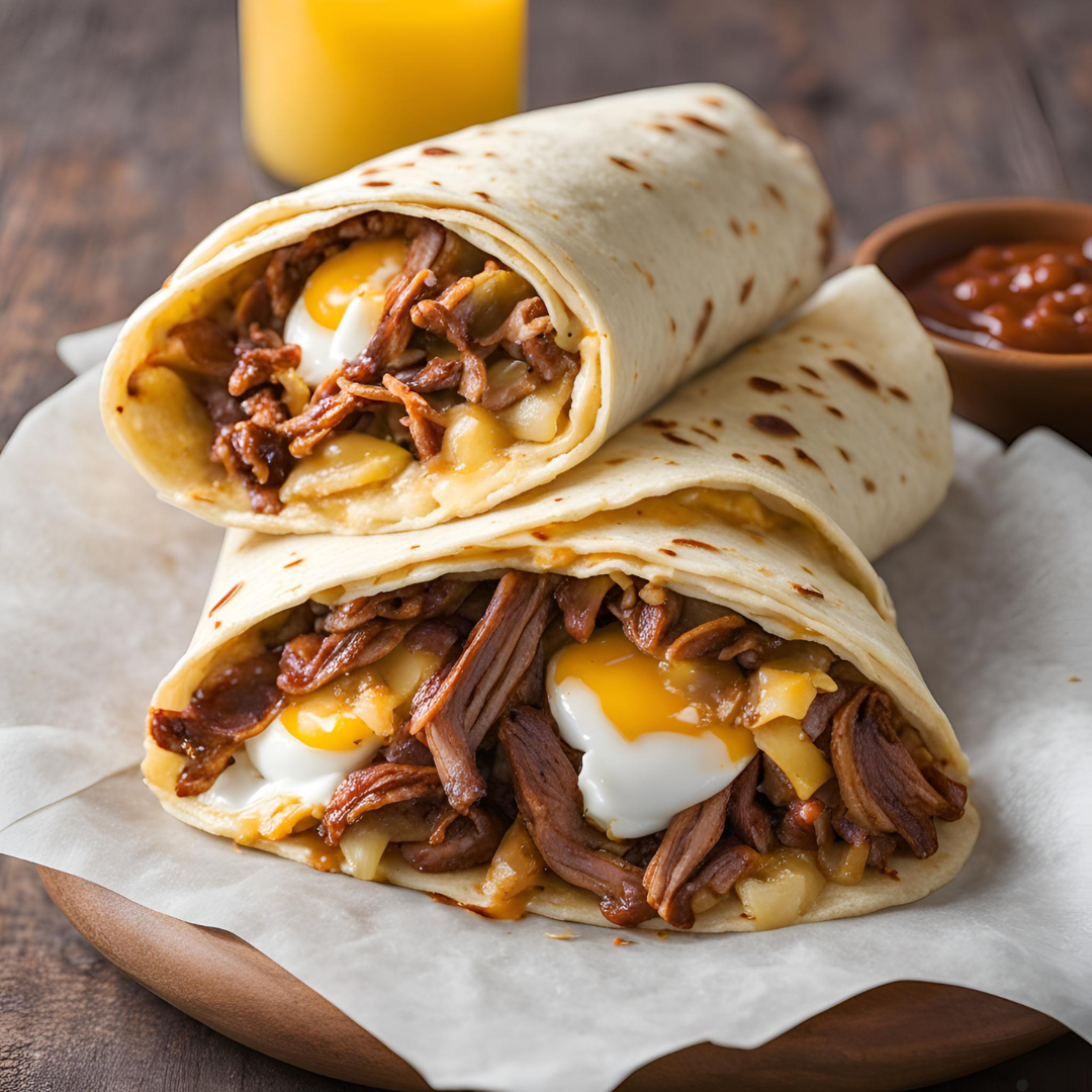 Pecan wood smoked Pork Shoulder, Breakfast Potatoes, Shredded Cheese, Scrambled Eggs and BBQ sauce in a Flour Tortilla