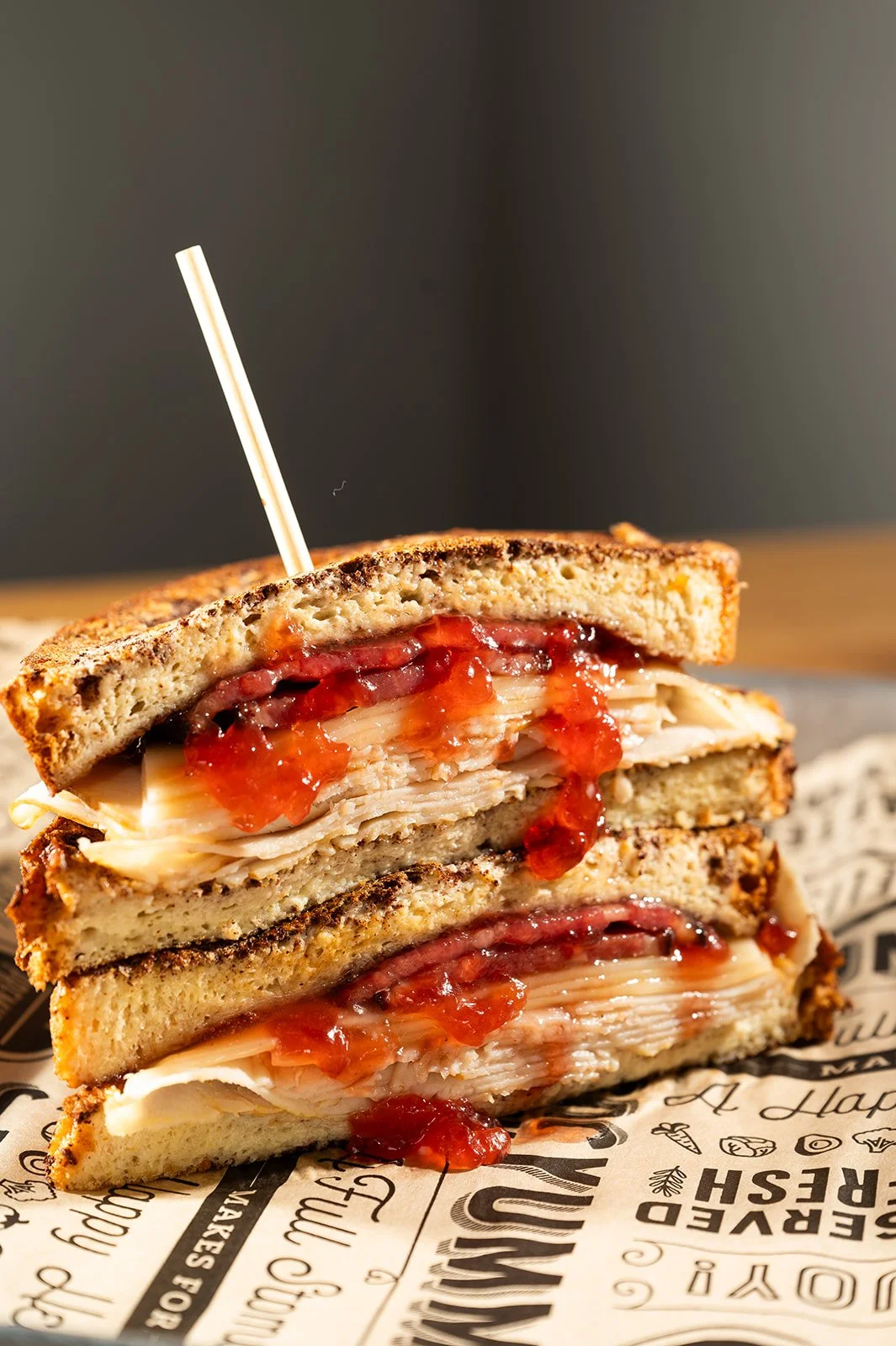 French Toast, Pecan Wood Smoked Pork Shoulder, Sliced Turkey, Swiss Cheese, Dijon Mustard, and Strawberry Jam.