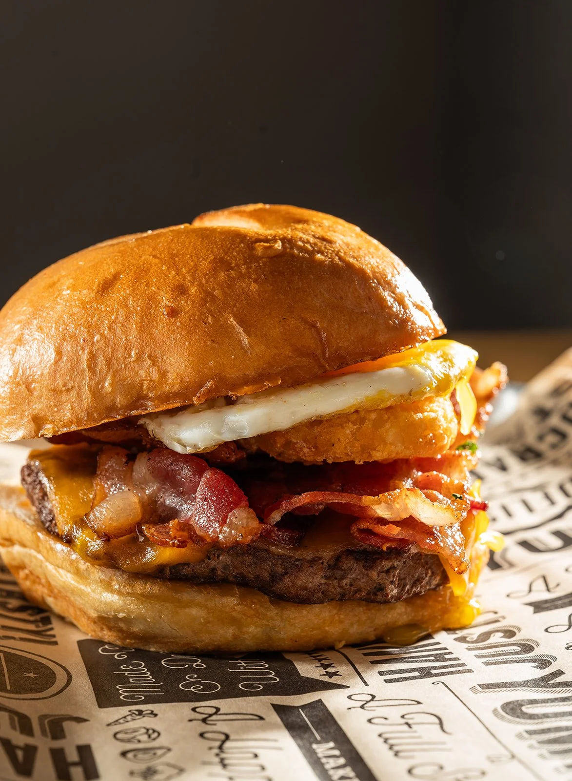 Brioche Bun, ⅓ lb Angus Beef Patty, Bacon, Fried Egg, Cheddar Cheese, Hash Brown and House Sauce.