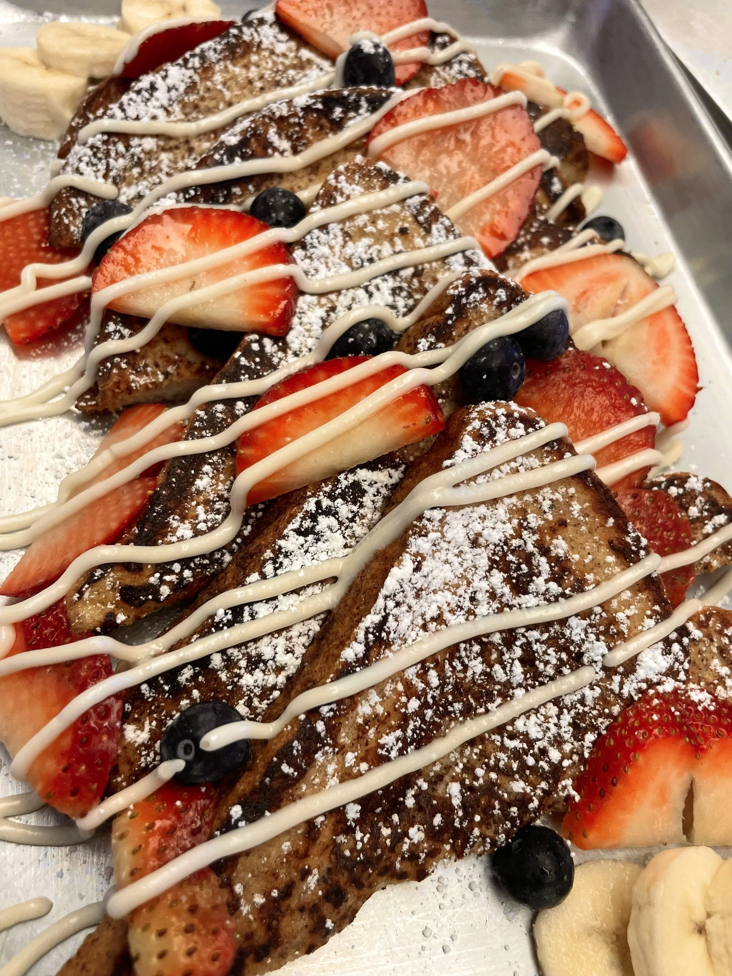 3 Thick cut Brioche Bread French Toast, topped with Powdered Sugar, Cream Cheese Icing, Blueberries, Strawberries and Bananas. Served with Maple Syrup.