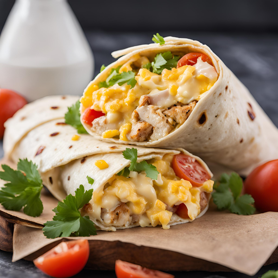 Grilled Chicken, Breakfast Potatoes, Parmesan Cheese, Diced Tomatoes, Scrambled Eggs and Garlic Aioli in a Flour Tortilla.