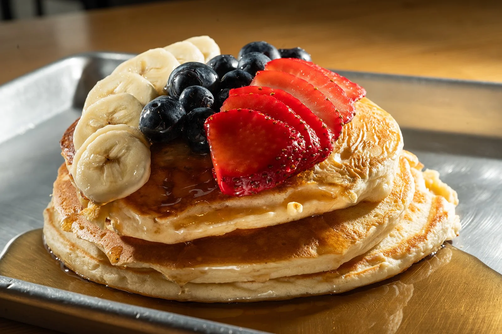 3 Fluffy pancakes served with your choice of Blueberries, Strawberries or Bananas. Served with Maple Syrup and Whipped Butter.