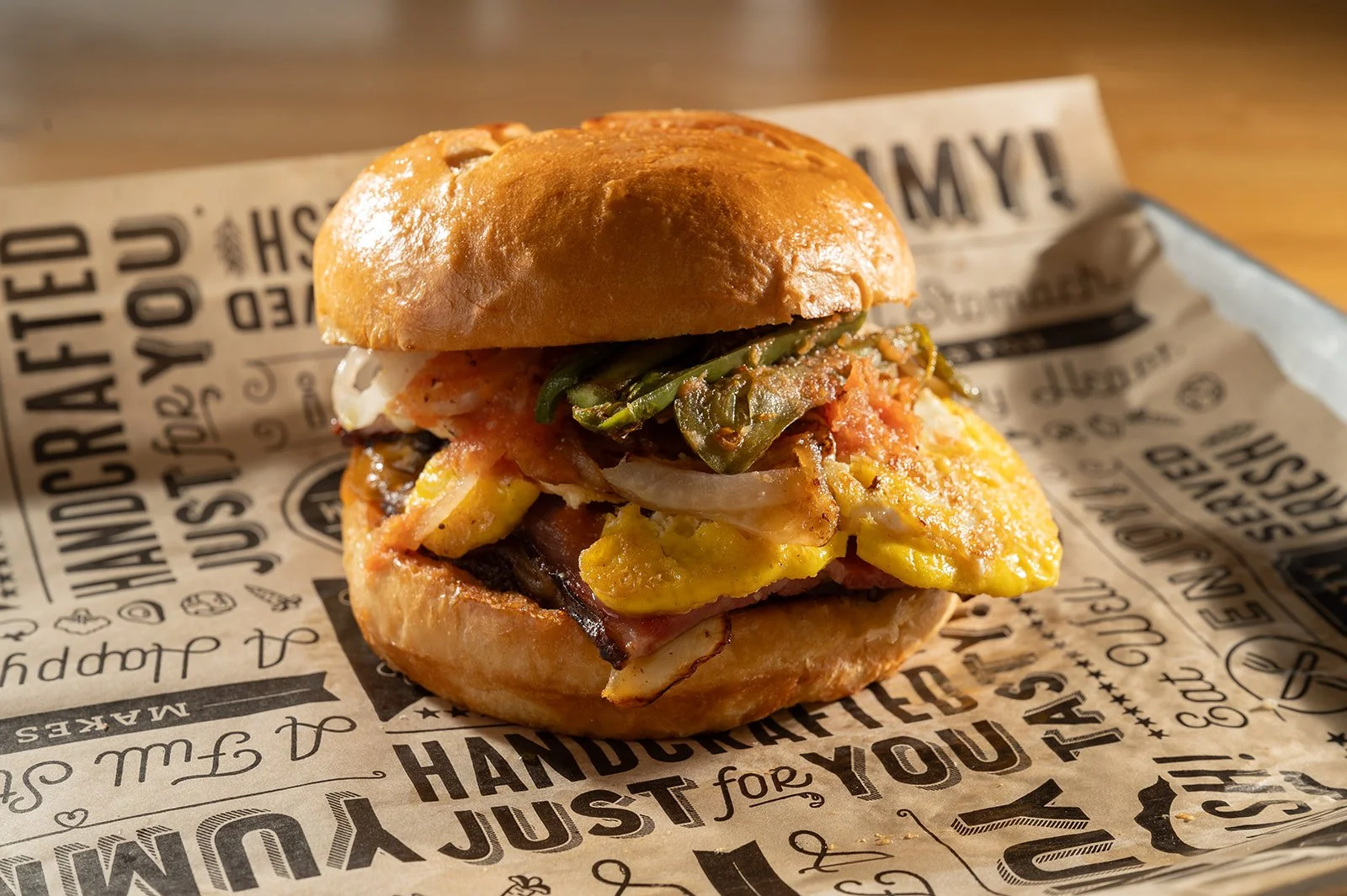 Brioche Bun, ⅓ lb Angus Beef Patty, Jalapeno Bacon, Cheddar Cheese, Scrambled Egg, Habanero Salsa, Grilled Onions, and Roasted Jalapeños.