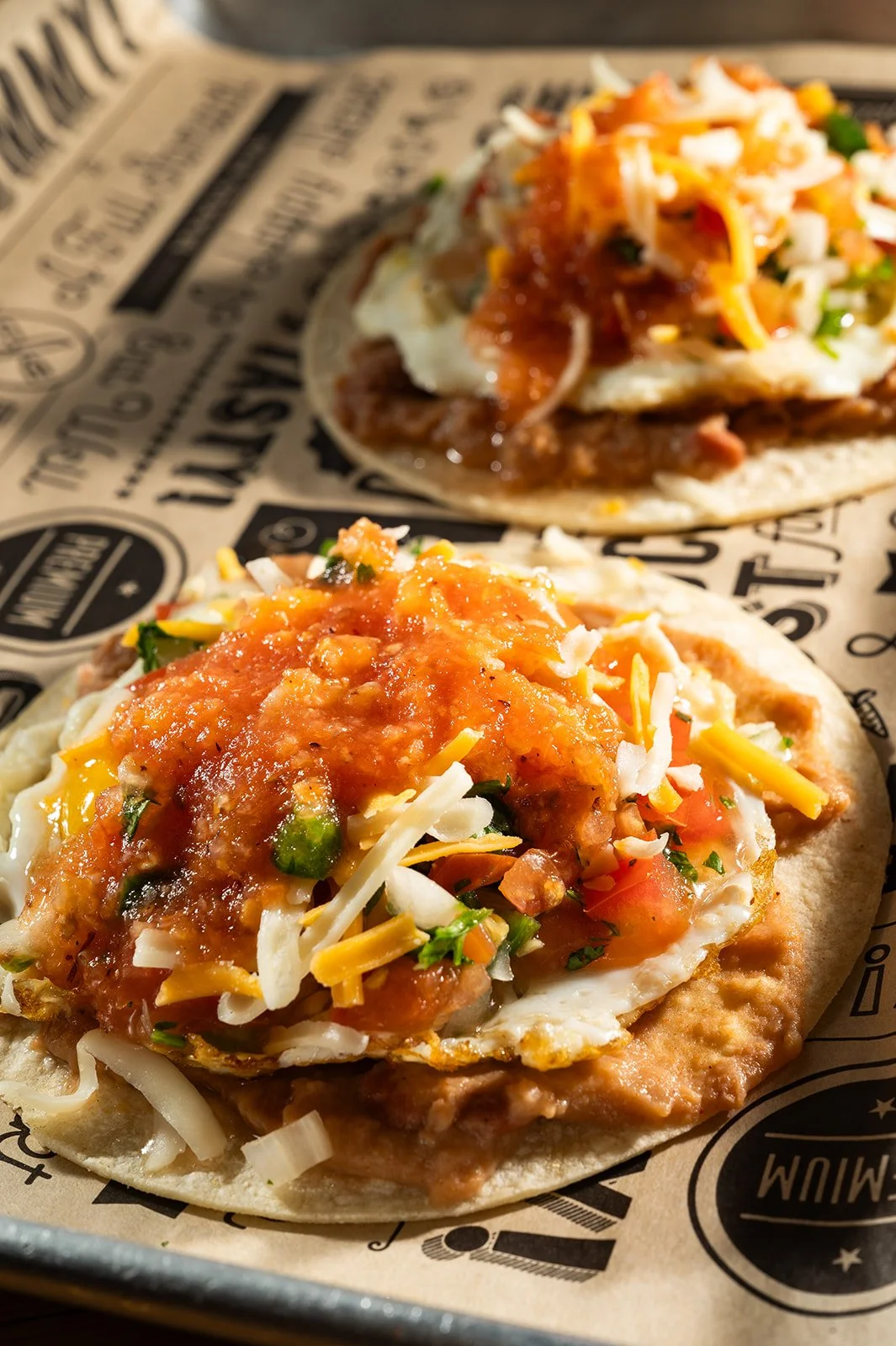 Corn Tortillas, Refried Beans, Fried Eggs, Fresh Pico de Gallo, Green Chili, Avocado, and Shredded Jack Cheese.