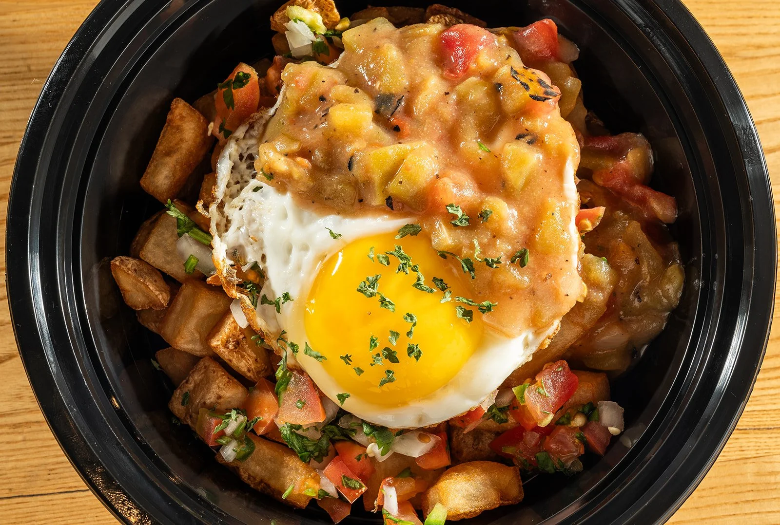 Breakfast Potatoes, Fried Egg, Fresh Pico de Gallo and Green Chili